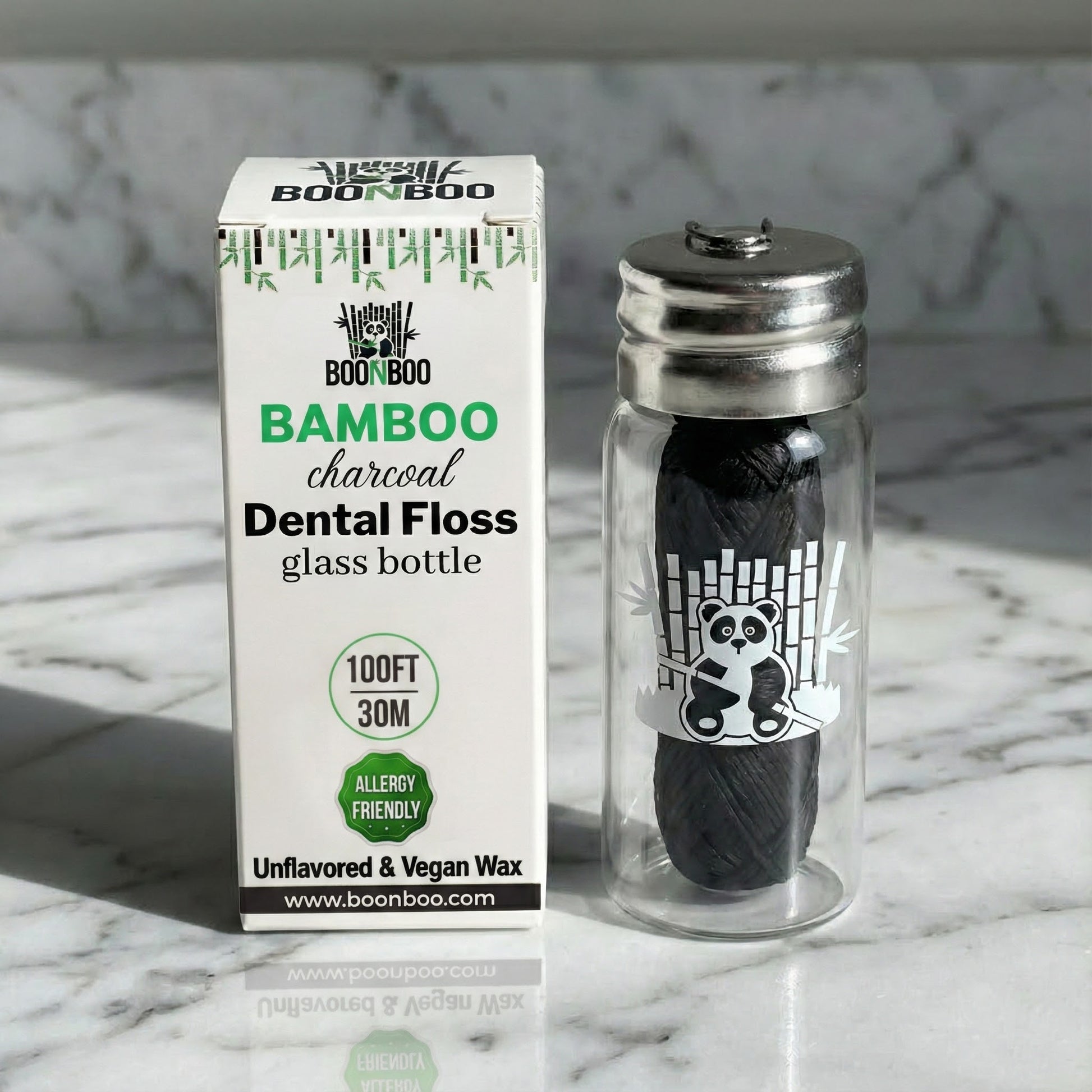 BOONBOO Charcoal Dental Floss is designed to support effective daily oral care with a slightly thicker woven charcoal thread that helps clean between teeth and around braces. The candelilla wax coating ensures a smooth glide, while the mint flavor adds a refreshing finish. Each floss roll is independently lab-tested PFAS-free and packaged in FSC-certified, plastic-free paper box. The reusable glass bottle minimizes waste, offering a sustainable alternative to disposable plastic dispensers.