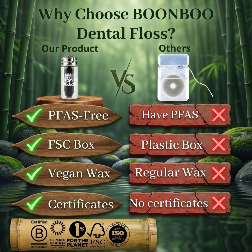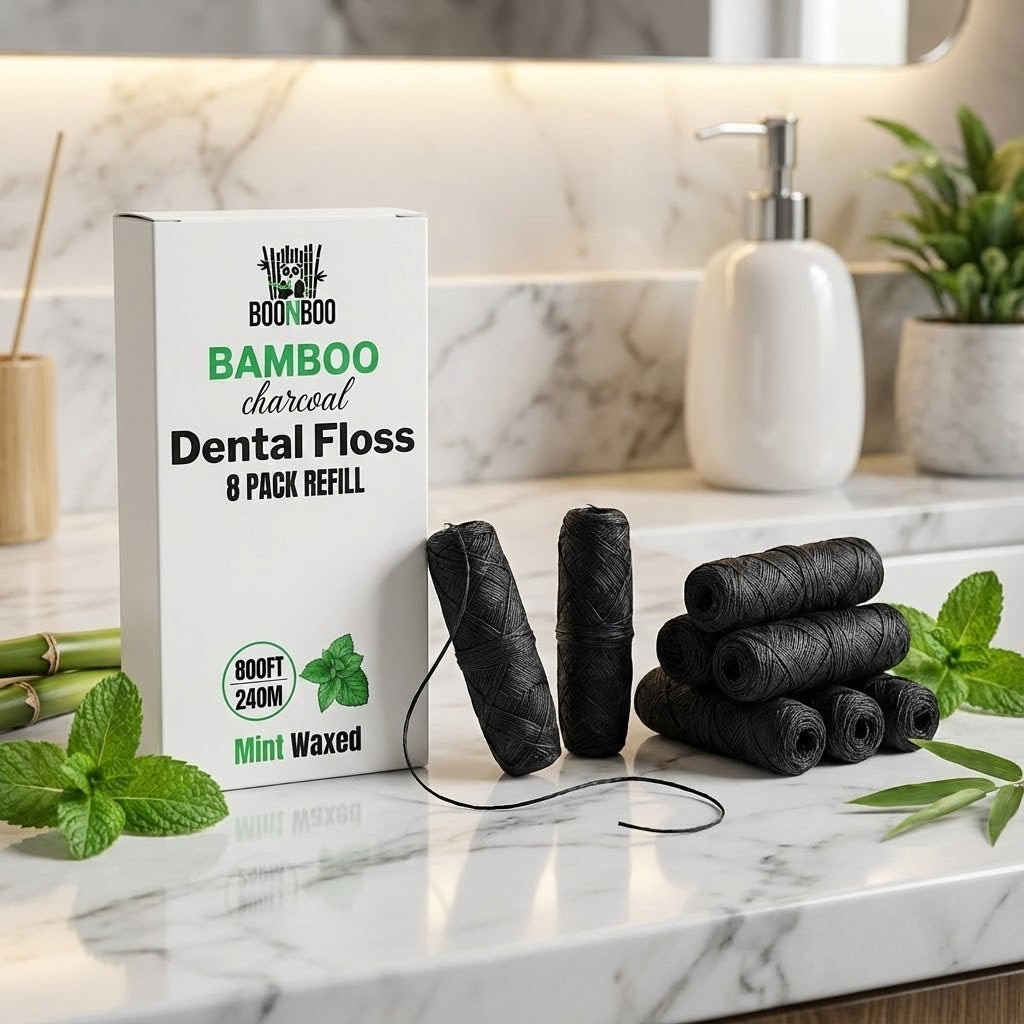 BOONBOO Woven Dental Floss Refills are designed to support effective daily flossing with a slightly thicker woven charcoal thread that helps clean between teeth and around tight spaces. Coated with candelilla wax for smooth gliding and lightly infused with peppermint essential oil (mint version), these refills provide a comfortable flossing experience. They are independently lab tested and PFAS-free.